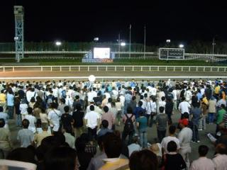<写真は生ファンファーレで盛り上がる旭川競馬場スタンド正面>