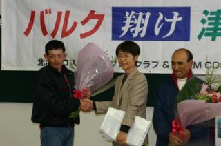 2・壮行会の模様。千葉津代士騎手と堅く握手をする岡田美佐子オーナー
