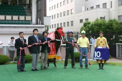 第49回ステイヤーズカップ オースミシュネル号勝利 小林靖幸騎手 道営重賞初制覇 2005.06.22 本日の第49回『ステイヤーズカップ』では、3番人気のオースミシュネルに騎乗した 小林靖幸騎手が序盤から終始後方に待機し、最終コーナーの直線に入ると大外からバンブーボカ、 ビコーアファイアを一気にかわし、勝利を手にしました。 オースミシュネルは道営移籍後、14戦11勝で圧倒的な強さを見せており、さすがはサンデーサイレンス 産駒で今後も活躍が楽しみです。 また、同騎手は平成9年9月30日の初騎乗から初めての道営重賞制覇で、今後の騎乗にも期待がかかります。