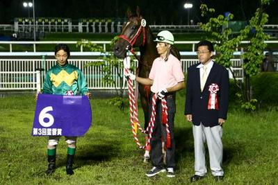 旭川ナイトレースの第3回星雲賞(3歳以上オープン 1,600m)が不良馬場の10頭立で行われ、山口竜一騎手鞍上の1番人気ジンクライシス号が1分38秒5のレコードタイムで優勝を飾りました。同馬はホッカイドウ競馬移籍後、赤レンガ記念に続き今期重賞2勝目。