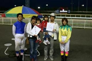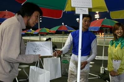 7回目をむかえた「旭川ジョッキーシート」は、両騎手がラッキーシートの当選者1人1人にサイン色紙や競馬グッズをプレゼントし、また、一緒に写真撮影も行い、ファンは大喜びでした。