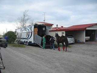 馬運車には、ファンから届いた必勝祈願の千羽鶴も積み込まれ厩舎関係者と報道陣が見守る中、いつもと変わりなく馬運者に乗り込み悲願の国内GⅠ制覇へ向け出発。