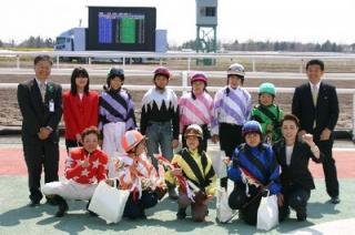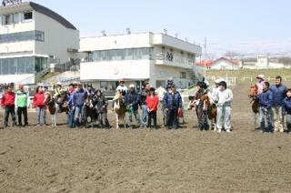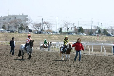 ポニーレースでファンを魅了! 2007.05.03 5月3日、浦河ポニー乗馬少年団によるポニーレース『第3回浦河ジュニア・ジョッキー杯』が門別競馬場で行われ、直線300mの迫力あるレースを駆けつけた大勢のファンに披露しました! 優勝したのは、広瀬楓さん(小学校4年生)騎乗のガンバレタロウくん! また、入場と同時に配られたポニー券では、1着・2着のポニー券を持っている方に「ひだかいちご」と「メロンパン」がプレゼントされました。 写真 上:走り終えたポニー 中:走路内で記念撮影 下:表彰式での記念撮影