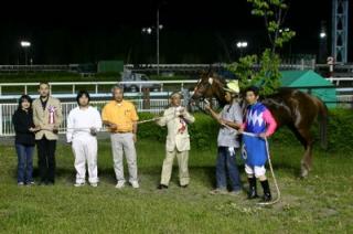 第8回目は「アグネスフライト賞」で、旭川市の金子尚広さんがプレゼンターを務め、優勝馬インカローズの國信調教師(馬主代理)、小国博行騎手に記念品を贈呈しました。