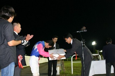 下:サンケイスポーツ社から小国騎手へ記念品を贈呈