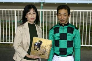 第19回 スタリオン競走表彰プレゼンター 2007.07.19 7月19日、旭川競馬場で「第19回 スタリオン競走表彰プレゼンター」が行われました。 第19回目は「マンハッタンカフェ賞」で、上川町のファンがプレゼンターを務め、優勝馬ビービーライナーの馬主と山口竜一騎手にそれぞれ記念品を贈呈しました。 また、プレゼンターには、社台スタリオンステーションから提供された「種牡馬パンフレット」が贈られました。 写真 上:口取り写真に参加 中:優勝騎手にトロフィーを贈呈 下:「種牡馬パンフレット」をもらい、山口騎手と記念撮影