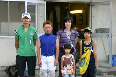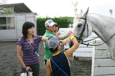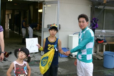 第2回 親子見学会 2007.08.07 8月7日、旭川競馬場において『第2回 親子見学会』が行われ、士別市の親子4名が参加しました。 参加者は、普段立ち入ることの出来ない装鞍所や決勝審判室などを見学し、検量室では、宮崎騎手、秋田騎手、五十嵐騎手からサインをもらい、記念撮影をしました。 また、検量室前で誘導馬のヨシカツヒーローに実際に触れ、「かわいい~!、やわらかい~!」と大喜びでした! 写真 上:宮崎騎手からサインをもらい、笑顔で握手 中:秋田騎手と親子4人で記念撮影 下:誘導馬に実際に触れ大喜び!