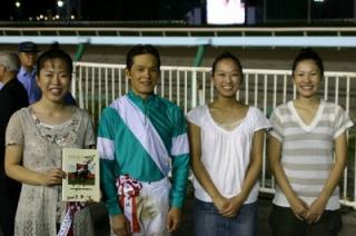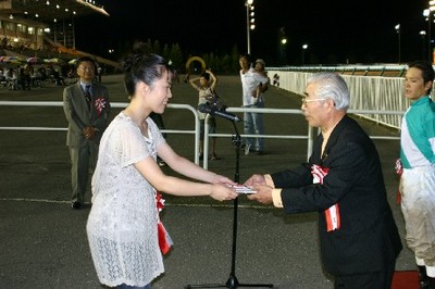 第27回 スタリオン競走表彰プレゼンター 2007.08.14 8月14日、旭川競馬場で「第27回 スタリオン競走表彰プレゼンター」が行われました。 第27回目は「アグネスデジタル賞」で、沼田町の祭りのPRで競馬場を訪れていたミスあんどんがプレゼンターを務め、優勝馬ジェイドファストの馬主 松平氏と川島雅人騎手にそれぞれ記念品を贈呈しました。 また、プレゼンターには、(有)ビッグレッドファームから提供された「種牡馬パンフレット」が贈られました。 写真 上:優勝馬ジェイドファストと口取り写真 中:馬主へ目録の贈呈 下:川島雅人騎手と記念撮影