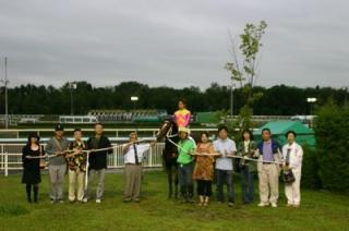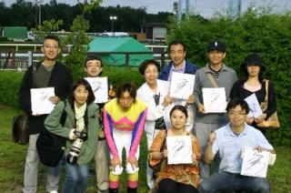 第15回 優勝馬との写真撮影体験! 2007.08.16 8月16日、旭川競馬場で、第15回「優勝馬との写真撮影体験」が行われ、ファン9名が写真撮影を行いました。 参加者は、第7レースの優勝馬パインゴーディ、原調教師、伊藤千尋騎手らと口取り写真に参加しました。 撮影後には、伊藤騎手からサインをもらい記念撮影をしました。 写真 上:優勝馬パインゴーディとの口取り写真 下:伊藤千尋騎手と記念撮影