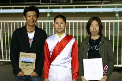 第30回 スタリオン競走表彰プレゼンター 2007.09.04 第30回目は「テイエムオペラオー賞」で、兵庫県のファンがプレゼンターを務め、優勝馬サクラヴェローチェの林和弘調教師(馬主代理)と佐々木国明騎手にそれぞれ記念品を贈呈しました。 また、プレゼンターには、日高軽種馬農業協同組合から提供された「種牡馬パンフレット」が贈られました。 写真 上:林和弘調教師へ目録贈呈 中:佐々木騎手へトロフィー贈呈 下:サインをもらい、記念撮影