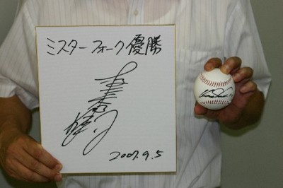 下:プレゼントの『佐々木主浩さんのサインボール』と『坂下騎手のサイン色紙』