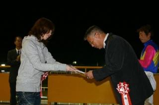第32回目は「トウカイテイオー賞」で、神奈川県のファンがプレゼンターを務め、優勝馬ピエールバスターの堂山調教師(馬主代理)と服部騎手にそれぞれ記念品を贈呈しました。