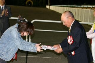 第35回目は「スウェプトオーヴァーボード賞」で、深川市のファンがプレゼンターを務め、優勝馬マイレディーキセキの林正夫調教師(馬主代理)と服部騎手にそれぞれ記念品を贈呈しました。