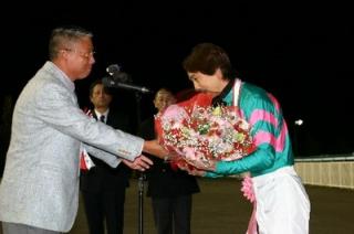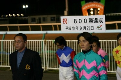 9月26日、旭川競馬場で9月25日に800勝を達成した川島洋人騎手(田中正二厩舎)の表彰式が同競馬場スタンド正面で行われ、かけつけた多くのファンや関係者の祝福を受けました。