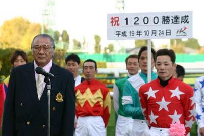 五十嵐冬樹騎手 1,200勝達成表彰式! 2007.10.25 10月25日、札幌競馬場で前日(10月24日)に1,200勝を達成した五十嵐騎手(桑原厩舎)の表彰式が同競馬場ウィナーズサークルで行われ、かけつけた多くのファンや関係者の祝福を受けました。 また、表彰式終了後には、五十嵐騎手から集まったファンに花束やサイン色紙がプレゼントされました。 写真 上:(左)桑原調教師、(右)五十嵐騎手 中:表彰式には騎手仲間も後ろに整列 下:堂山調騎会長から花束贈呈