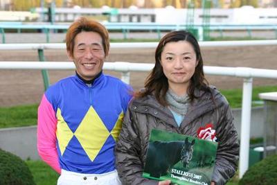 第47回 スタリオン競走表彰プレゼンター 2007.11.07 11月7日、札幌競馬場で「第47回 スタリオン競走表彰プレゼンター」が行われました。 第47回目は「アドマイヤジャパン賞」で、新ひだか町のファンがプレゼンターを務め、優勝馬ディアダンサーの谷口調教師(馬主代理)と服部騎手にそれぞれ記念品を贈呈しました。 また、プレゼンターには、(株)サラブレッド・ブリーダーズ・クラブから提供された『種牡馬パンフレット』が贈られました。 写真 上:優勝馬ディアダンサーとの口取り写真 中:谷口調教師へ目録贈呈 下:服部騎手と記念撮影