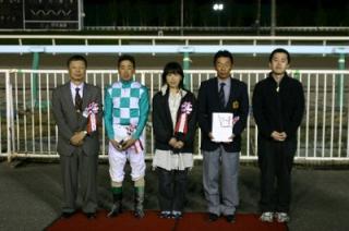 第4回目は「タイムパラドックス賞」で、神奈川県のファンがプレゼンターを務め、優勝馬タグファイトの松本隆宏調教師(馬主代理)と宮崎光行騎手にそれぞれ記念品を贈呈しました。