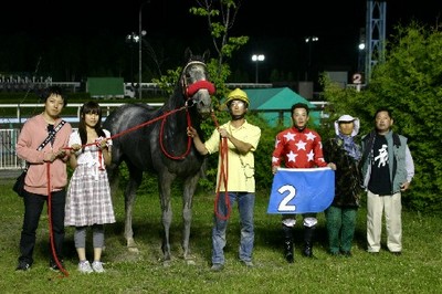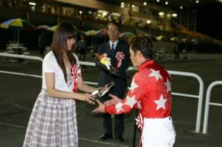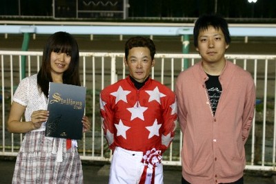 第10回 スタリオン競走表彰プレゼンター 2008.06.24 6月24日、旭川競馬場で本日2回目の「スタリオン競走表彰プレゼンター」 が行われました。 第10回目は「ザッツザプレンティ賞」で、福岡県のファンがプレゼンター を務め、優勝馬チェリーゴロンタの廣森久雄調教師(馬主代理)と五十嵐冬樹 騎手にそれぞれ記念品を贈呈しました。 また、プレゼンターには、(株)レックスから提供された『スタリオンブック』 等が贈られました。 写真 上:優勝馬チェリーゴロンタと口取り写真 中:五十嵐冬樹騎手へ記念品贈呈 下:五十嵐冬樹騎手と記念写真