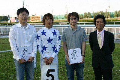 第6回 優勝馬との写真撮影体験! 2008.06.26 6月26日、旭川競馬場で「第6回 優勝馬との写真撮影体験」が行われ、 大阪府のファン2名が写真撮影を行いました。 参加者は、第8レースの優勝馬ラブラブガッキー号、優勝馬関係者と口取 り写真に参加しました。 写真 上:優勝馬ラブラブガッキー号と口取り写真 下:優勝馬関係者と記念写真