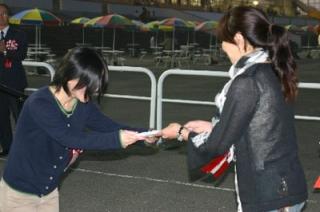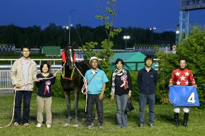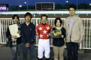 第11回 スタリオン競走表彰プレゼンター 2008.06.26 6月26日、旭川競馬場で第11回「スタリオン競走表彰プレゼンター」が行わ れました。 第11回目は「スウェプトオーヴァーボード賞」で、大阪府のファンがプレゼン ターを務め、優勝馬スカーレットリバーの馬主 鹿戸照美氏と五十嵐冬樹騎手にそ れぞれ記念品を贈呈しました。 また、プレゼンターには、(株)サラブレッド・ブリーダーズ・クラブから提供 された『スタリオンブック』等が贈られました。 写真 上:優勝馬スカーレットリバーと口取り写真 中:馬主へ記念品贈呈 下:優勝馬関係者と記念写真
