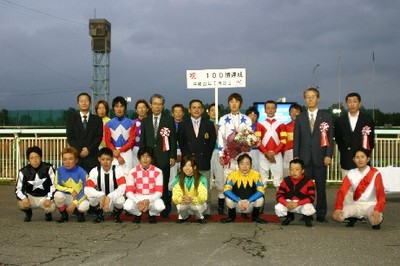 7月23日、旭川競馬場で7月22日に100勝を達成した桑村真明騎手(角川秀樹厩舎)の表彰式が同競馬場スタンド正面で行われ、多くのファンや関係者の祝福を受けました。