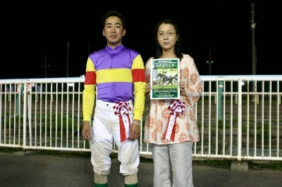 第20回 スタリオン競走表彰プレゼンター 2008.07.24 7月24日、旭川競馬場で第20回「スタリオン競走表彰プレゼンター」が行われました。 第20回目は「スズカマンボ賞」で、岩見沢市のファンがプレゼンターを務め、優勝馬カネマサディールの堂山芳則調教師(馬主代理)と宮崎光行騎手にそれぞれ記念品を贈呈しました。 また、プレゼンターには、(有)ホースバンクから提供された『スタリオンブック』等が贈られました。 写真 上:優勝馬カネマサディールと口取り写真 中:全員で記念撮影 下:宮崎光行騎手と記念写真