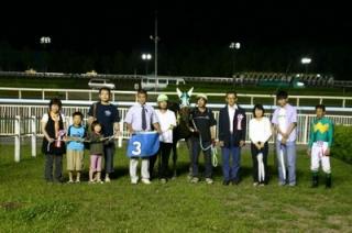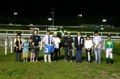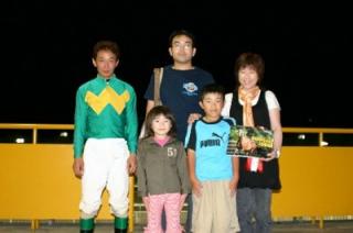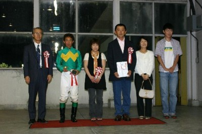 第23回 スタリオン競走表彰プレゼンター 2008.07.31 7月31日、旭川競馬場で第23回「スタリオン競走表彰プレゼンター」が行われました。 第23回目は「スターキングマン賞」で、当麻町のファンがプレゼンターを務め、優勝馬リバーストーン号の馬主 佐竹学 様と山口竜一騎手にそれぞれ記念品を贈呈しました。 また、プレゼンターには、(株)サラブレッド・ブリーダーズ・クラブから提供された『スタリオンブック』等が贈られました。 写真 上:優勝馬リバーストーン号と口取り写真 中:全員で記念撮影 下:山口竜一騎騎手と記念写真