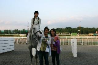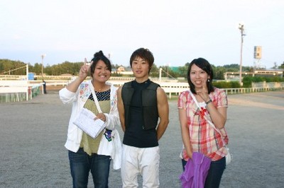 第12回 実況放送室・検量室観戦ツアー 2008.08.06 8月6日、旭川競馬場において、「第12回 実況放送室・検量室観戦ツアー」が行われ、東京都と千葉県のファンが見学しました。 2名は実況放送室で古川アナウンサーと内外タイムス社古谷記者が担当した第7レースのパドック解説を観戦、その後、検量室では桑村真明騎手と記念撮影し、サインをもらいました。 写真 上:桑村真明騎手と記念撮影 下:誘導馬と記念撮影