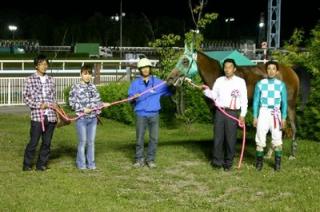 第26回 スタリオン競走表彰プレゼンター 2008.08.19 8月19日、旭川競馬場で第26回「スタリオン競走表彰プレゼンター」が行われました。 第25回目は「ボーンキング賞」で、旭川市のファンがプレゼンターを務め、優勝馬ディーズエトワール号の松本隆宏調教師(馬主代理)と宮崎光行騎手にそれぞれ記念品を贈呈しました。 また、プレゼンターには、(株)サラブレッド・ブリーダーズ・クラブから提供された『スタリオンブック』等が贈られました。 写真 上:優勝馬ディーズエトワール号と口取り写真 中:宮崎光行騎手記念品贈呈 下:宮崎光行騎手と記念写真