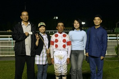 第12回 優勝馬との写真撮影体験! 2008.08.28 8月28日、旭川競馬場で「第12回 優勝馬との写真撮影体験」が行われ、 兵庫県から2名、神奈川県と東京都から4名のファンが写真撮影を行いました。 参加者は、第7レースの優勝馬フレキシブル号、優勝馬関係者と口取 り写真に参加しました。 写真 上:優勝馬フレキシブル号と口取り写真 下:坂下秀樹騎手と記念写真