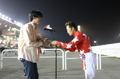 第30回 スタリオン競走表彰プレゼンター 2008.08.28 8月28日、旭川競馬場で第30回「スタリオン競走表彰プレゼンター」が行われました。 第30回目は「サウスヴィグラス賞」で大阪府のファンがプレゼンターを務め、優勝馬ラブストレングス号の村上調教師(馬主代理)と五十嵐冬樹騎手にそれぞれ記念品を贈呈しました。 また、プレゼンターには、(有)ホースバンクから提供された『スタリオンブック』等が贈られました。 写真 上:五十嵐冬樹騎手と記念写真 下:関係者と記念写真