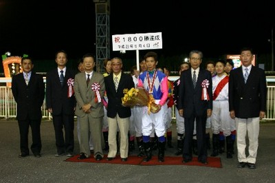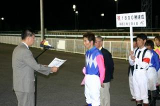 9月9日、旭川競馬場で9月4日に1800勝を達成した小国博行騎手(堂山芳則厩舎)の表彰式が同競馬場スタンド正面で行われ、かけつけた多くのファンや関係者の祝福を受けました。