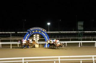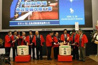 本日、午後6:30より門別競馬場内の新スタンド“ポラリス☆ドーム”にて、競馬場完成を祝う竣工祝賀会が開催されました。全国各地から競馬・軽種馬関係者200名以上が招待され、鏡開きやナイター照明点灯式、模擬レースなどを実施し、完成となった門別競馬場を祝いました。