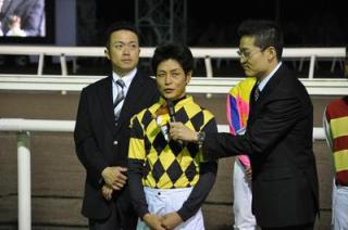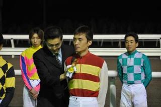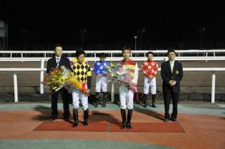 永島太郎騎手[兵庫]と吉田稔騎手[愛知] 歓迎セレモニー 2009.07.14 7月14日(火)から9月13日までの間、門別競馬「グランシャリオナイター」に期間限定騎乗する永島太郎騎手(兵庫県)と吉田稔騎手(愛知県)の歓迎セレモニーが第8レース終了後(19:45分)ウイナーズサークルで行われました。インタビューでは、両ジョッキーが期間中の活躍を誓いました。セレモニー終了後には、集まったファンに花束がプレゼントされました。 写真上:歓迎セレモニー 写真中:永島騎手インタビュー 写真下:吉田稔騎手インタビュー