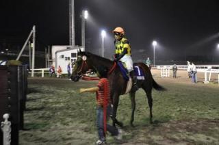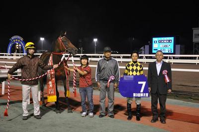 本日23日(木)、門別競馬場では、3歳馬による重賞、楽天競馬杯第9回華月賞(H3)〔チチカステナンゴ賞〕(1800m 晴 重)が開催され、愛知から期間限定騎乗している吉田稔騎手騎乗の単勝6番人気エイガゴールド号が、直線で粘る5番人気ムサシ号を差しきり優勝しました。(優勝タイム1:54:2)