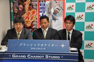 メインレースのパドック解説に酒井秀紀氏が来場 2009.07.30 7月30日(木)第9レースの「静内軽種馬生産振興会青年部特別」のパドック解説に、静内軽種馬生産振興会青年部長の酒井秀紀氏がゲストパドック解説として出演し、門別競馬場の楽しみ方や注目馬について話していただきました。 写真:ゲスト解説の酒井秀紀氏(中央)