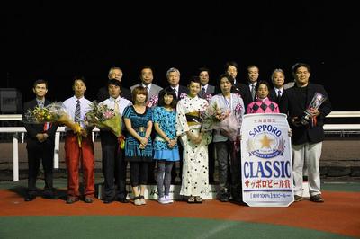 8月13日(木)、門別競馬場では、真夏の祭典 スポーツニッポン杯 第21回ブリーダーズゴールドカップ(JpnⅡ)[アドマイヤムーン賞](2000m 雨 重)が開催され、JRA岩田康誠騎手騎乗の単勝2番人気スマートファルコン号がレコードタイム2:02:2で優勝しました。