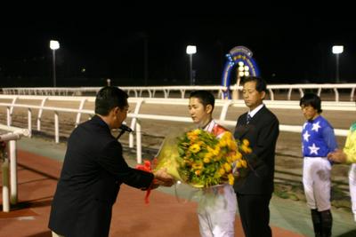 佐々木国明騎手 600勝達成表彰式 2009.08.18 8月18日(火)、門別競馬場で8月11日(火)第7レースファイヤーアップ号に騎乗し通算600勝を達成した佐々木国明騎手(若松平厩舎)の表彰式がウイナーズサークルで行われ、多くのファンや関係者の祝福を受けました。 表彰式終了後には、集まったファンに花束がプレゼントされました。 (プラカード 川島雅人騎手)