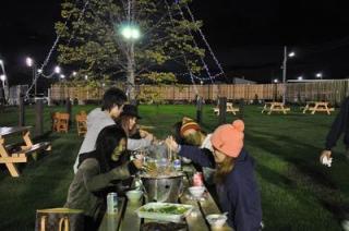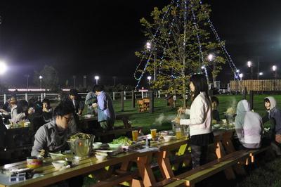 また、集中講義の課外学習の一環として、門別競馬場に学生50名が来場し、とねっこ広場でバケツジンギスカンや競馬観戦を楽しみました。参加者の中からコメントを伺うと「門別競馬場は初めて来ましたが、直線も長く迫力あるレースが観戦できて楽しいです。」「競馬場でジンギスカンを食事ができることに驚きました。ビヤガーデンみたいな雰囲気もいいですね。」とのコメント。これからも、団体でのグランシャリオナイターの観戦をお待ちしております。