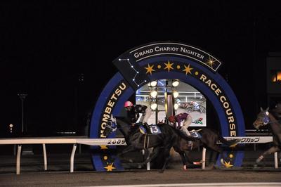 本日のメインレースは、未来優駿2009サッポロクラシックカップ(2歳オープン 1200m)。坂下秀樹騎手騎乗の単勝5番人気モエレデフィニット号が2着サンサンフロア号に1馬身差をつけて優勝しました(タイム1分13秒9)。