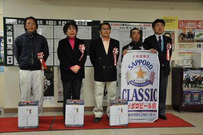 また、表彰式では、サッポロビール株式会社様より優勝馬の関係者に北海道限定の麦芽100%生ビール「サッポロクラシック」が副賞として贈呈され、坂下秀樹騎手には、1年分が贈られました。