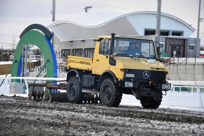ディスクハロー(写真中)で雪塊を砕いて、爪ハロー(写真下)で地ならしを行い、凍結防止剤を散布し、再び爪ハローを掛ける作業を繰り返し行います。
