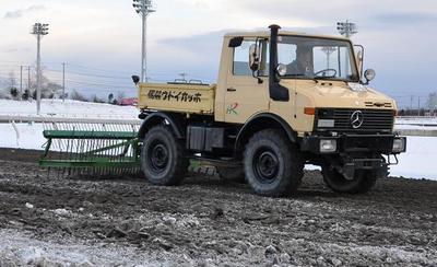 また、ホッカイドウ競馬といえば、毎年レベルの高い2歳馬を数多く輩出し、全国の競馬場で活躍していますが、今年もデビュー予定の2歳馬が、現在全体頭数(626頭)の約7割となる438頭(2010年1月4日現在)が入厩しており、各厩舎では、初期馴致調教が行われておりますが、これらの馬達が休むことなく調教が行えるよう、馬場管理スタッフは春めく日まで、凍結防止のため昼夜作業を続けなければなりません。デビュー戦を楽しみに、です。