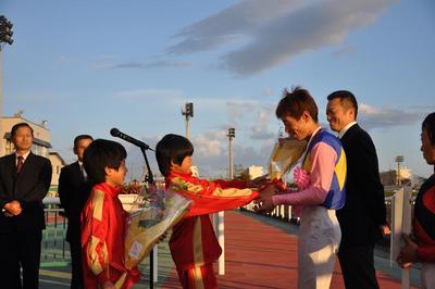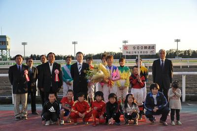 服部茂史騎手 900勝達成表彰式 2010.10.06 9月30日(木)、第1レースシュシュファレル号に騎乗し、中央・地方通算900勝を達成した服部茂史騎手(田中淳司厩舎)の表彰式がウイナーズサークルで行われ、ファンの方々や関係者の皆様の祝福をいただきました。