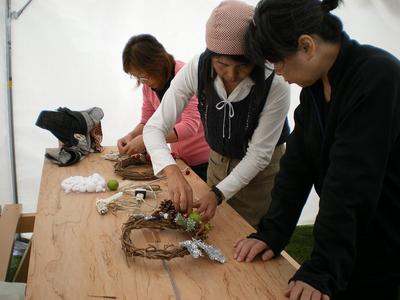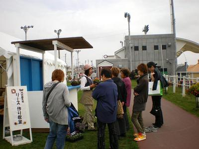第2回「リース作り教室」の開催について(門別競馬場) 2010.10.12 10月12日、お部屋に飾る「リース作り教室」をとねっこ広場で開催し、 町内の老人ホームの参加者を含む総勢15名のが、㈱サンガーデン 常務取締役 土谷 美紀さんの指導のもとリースを制作しました。また、隣のブースでは、秋のガーデニング用品とリース材料の即売会も実施しました。