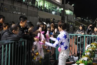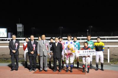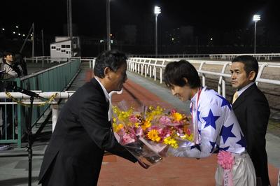 11月17日(水)、第7レースサルサデラルス号に騎乗し、中央・地方通算300勝を達成した桑村真明騎手(角川秀樹厩舎)の表彰式が11月18日(木)第9競走終了後、ウイナーズサークルで行われ、ファンの方々や関係者の皆様の祝福をいただきました。