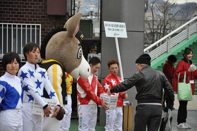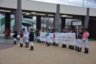 当日は、ホッカイドウ競馬所属23名の騎手と期間限定騎乗の本田忠成騎手(川崎)、寺地誠一騎手(兵庫)を含め全25名の騎手が参加し、「がんばろう!日本」と「届けたい想いがあるから、私たちは走り続けます。」の横断幕を持って、来場者への募金を呼び掛けました。