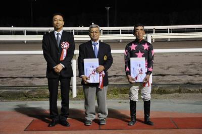 また、協賛競走の表彰式では、北海道漁業協同組合連合会日高支店長 阿部 陽一様より優勝馬ヴィクトリーリード号の関係者に副賞が贈られました。