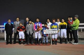 小国 博行騎手 2,000勝達成表彰式 2012.04.25 昨年の11月17日(木)第11レースでグレンチェック号に騎乗し、地方・中央通算2,000達成した小国 博行騎手(堂山 芳則厩舎)の表彰式が本日の第8競走終了後、ウイナーズサークルで行われました。