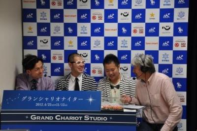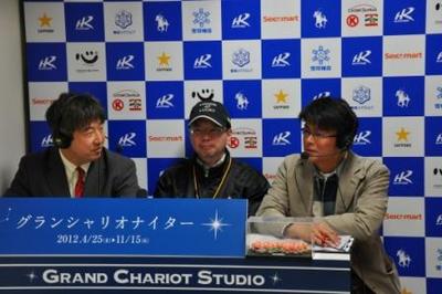 本日のグランシャリオスタジオ 2012.05.03 第3競走のパドック解説のゲストに札幌よしもと芸人しろっぷが出演し、初めて訪れた門別 競馬場の印象について話して頂きました。 第5競走のゲストには競馬コラムニスト河村清明氏が出演し、海外競馬関係キャップ販売についての 目的や注目馬について話して頂きました。